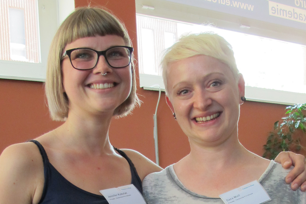 Jennifer Kubutat und Dana Wolf sind im vierten Semester ihrer Erzieherinnen-Ausbildung an der Pro Inklusio Fachschule für Sozialpädagogik in Berlin. Beide sind Quereinsteigerinnen – Jennifer Kubutat war Gesundheits- und Krankenpflegerin, Dana Wolf Verwaltungsfachangestellte. Gemeinsam mit ihren Kommilitonen/innen besuchten sie den Aktionstag an der Euro Akademie. Für sie gehört Vielfalt zum Leben, sie wissen aber auch, dass sie (noch) keine Selbstverständlichkeit ist.